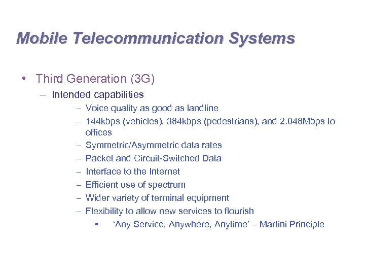 Mobile Telecommunication Systems • Third Generation (3 G) – Intended capabilities – Voice quality as good as landline – 144 kbps (vehicles), 384 kbps (pedestrians), and 2. 048 Mbps to offices – Symmetric/Asymmetric data rates – Packet and Circuit-Switched Data – Interface to the Internet – Efficient use of spectrum – Wider variety of terminal equipment – Flexibility to allow new services to flourish • ‘Any Service, Anywhere, Anytime’ – Martini Principle