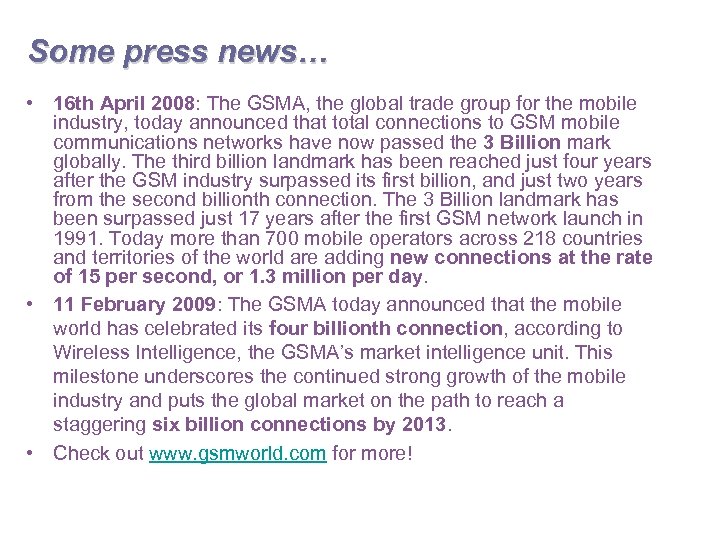 Some press news… • 16 th April 2008: The GSMA, the global trade group for the mobile industry, today announced that total connections to GSM mobile communications networks have now passed the 3 Billion mark globally. The third billion landmark has been reached just four years after the GSM industry surpassed its first billion, and just two years from the second billionth connection. The 3 Billion landmark has been surpassed just 17 years after the first GSM network launch in 1991. Today more than 700 mobile operators across 218 countries and territories of the world are adding new connections at the rate of 15 per second, or 1. 3 million per day. • 11 February 2009: The GSMA today announced that the mobile world has celebrated its four billionth connection, according to Wireless Intelligence, the GSMA’s market intelligence unit. This milestone underscores the continued strong growth of the mobile industry and puts the global market on the path to reach a staggering six billion connections by 2013. • Check out www. gsmworld. com for more!