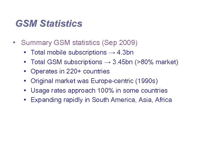 GSM Statistics • Summary GSM statistics (Sep 2009) • • • Total mobile subscriptions → 4. 3 bn Total GSM subscriptions → 3. 45 bn (>80% market) Operates in 220+ countries Original market was Europe-centric (1990 s) Usage rates approach 100% in some countries Expanding rapidly in South America, Asia, Africa