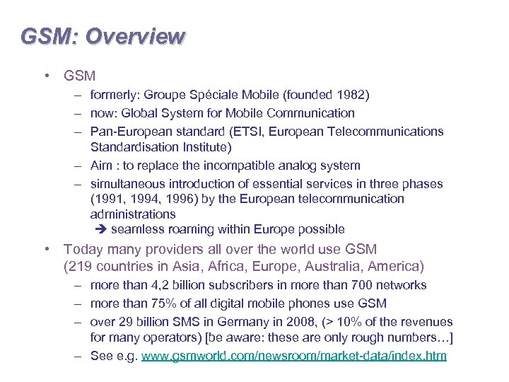 GSM: Overview • GSM – formerly: Groupe Spéciale Mobile (founded 1982) – now: Global System for Mobile Communication – Pan-European standard (ETSI, European Telecommunications Standardisation Institute) – Aim : to replace the incompatible analog system – simultaneous introduction of essential services in three phases (1991, 1994, 1996) by the European telecommunication administrations seamless roaming within Europe possible • Today many providers all over the world use GSM (219 countries in Asia, Africa, Europe, Australia, America) – more than 4, 2 billion subscribers in more than 700 networks – more than 75% of all digital mobile phones use GSM – over 29 billion SMS in Germany in 2008, (> 10% of the revenues for many operators) [be aware: these are only rough numbers…] – See e. g. www. gsmworld. com/newsroom/market-data/index. htm