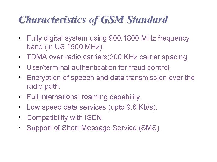 Characteristics of GSM Standard • Fully digital system using 900, 1800 MHz frequency band (in US 1900 MHz). • TDMA over radio carriers(200 KHz carrier spacing. • User/terminal authentication for fraud control. • Encryption of speech and data transmission over the radio path. • Full international roaming capability. • Low speed data services (upto 9. 6 Kb/s). • Compatibility with ISDN. • Support of Short Message Service (SMS).