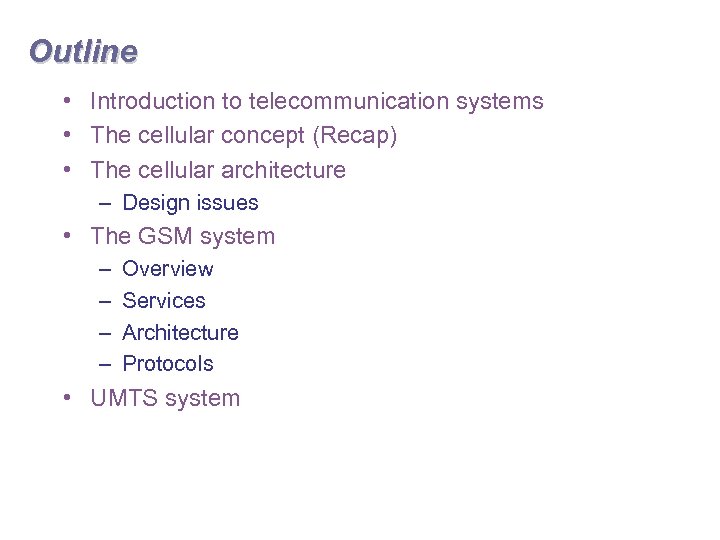 Outline • Introduction to telecommunication systems • The cellular concept (Recap) • The cellular architecture – Design issues • The GSM system – – Overview Services Architecture Protocols • UMTS system