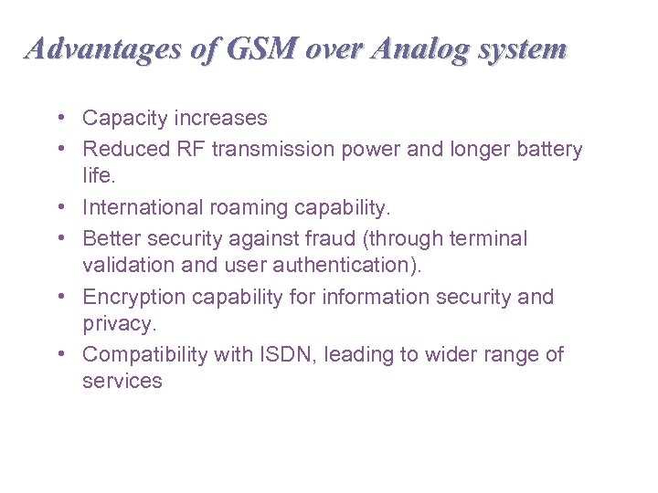 Advantages of GSM over Analog system • Capacity increases • Reduced RF transmission power and longer battery life. • International roaming capability. • Better security against fraud (through terminal validation and user authentication). • Encryption capability for information security and privacy. • Compatibility with ISDN, leading to wider range of services