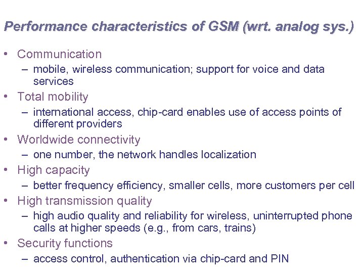 Performance characteristics of GSM (wrt. analog sys. ) • Communication – mobile, wireless communication; support for voice and data services • Total mobility – international access, chip-card enables use of access points of different providers • Worldwide connectivity – one number, the network handles localization • High capacity – better frequency efficiency, smaller cells, more customers per cell • High transmission quality – high audio quality and reliability for wireless, uninterrupted phone calls at higher speeds (e. g. , from cars, trains) • Security functions – access control, authentication via chip-card and PIN