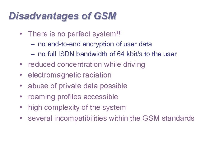 Disadvantages of GSM • There is no perfect system!! – no end-to-end encryption of user data – no full ISDN bandwidth of 64 kbit/s to the user • • • reduced concentration while driving electromagnetic radiation abuse of private data possible roaming profiles accessible high complexity of the system several incompatibilities within the GSM standards