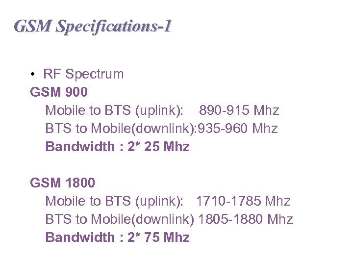 GSM Specifications-1 • RF Spectrum GSM 900 Mobile to BTS (uplink): 890 -915 Mhz BTS to Mobile(downlink): 935 -960 Mhz Bandwidth : 2* 25 Mhz GSM 1800 Mobile to BTS (uplink): 1710 -1785 Mhz BTS to Mobile(downlink) 1805 -1880 Mhz Bandwidth : 2* 75 Mhz