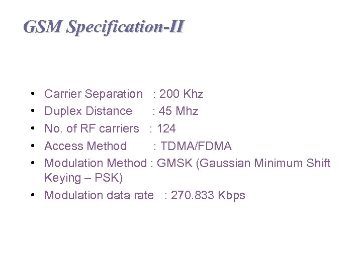 GSM Specification-II • • • Carrier Separation : 200 Khz Duplex Distance : 45 Mhz No. of RF carriers : 124 Access Method : TDMA/FDMA Modulation Method : GMSK (Gaussian Minimum Shift Keying – PSK) • Modulation data rate : 270. 833 Kbps