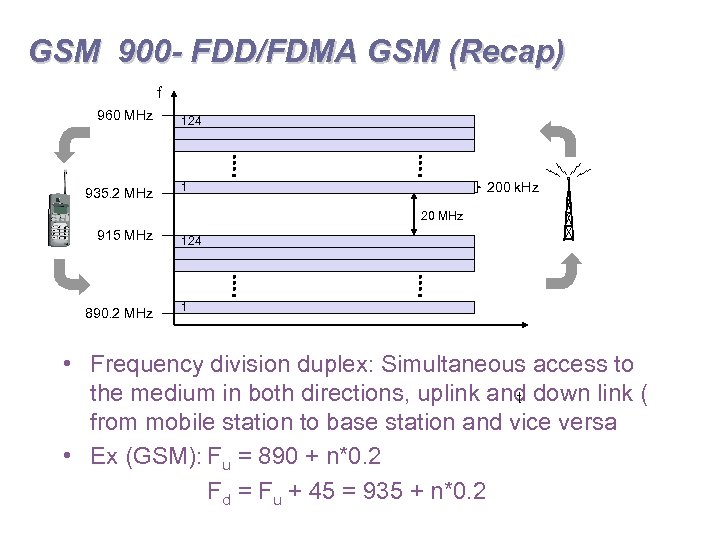 GSM 900 - FDD/FDMA GSM (Recap) f 960 MHz 935. 2 MHz 124 200 k. Hz 1 20 MHz 915 MHz 890. 2 MHz 124 1 • Frequency division duplex: Simultaneous access to the medium in both directions, uplink and down link ( t from mobile station to base station and vice versa • Ex (GSM): Fu = 890 + n*0. 2 Fd = Fu + 45 = 935 + n*0. 2
