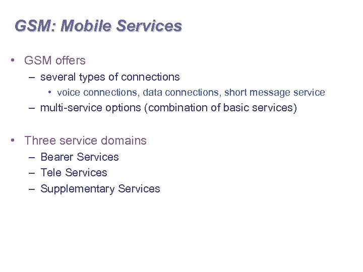 GSM: Mobile Services • GSM offers – several types of connections • voice connections, data connections, short message service – multi-service options (combination of basic services) • Three service domains – Bearer Services – Tele Services – Supplementary Services