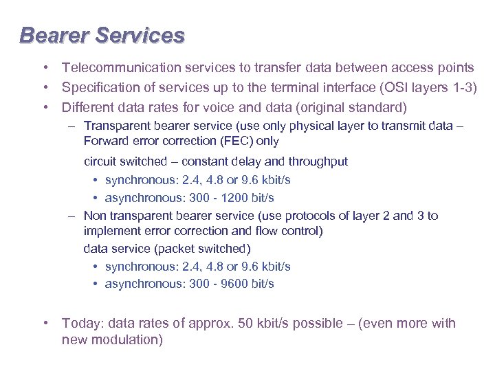 Bearer Services • Telecommunication services to transfer data between access points • Specification of services up to the terminal interface (OSI layers 1 -3) • Different data rates for voice and data (original standard) – Transparent bearer service (use only physical layer to transmit data – Forward error correction (FEC) only circuit switched – constant delay and throughput • synchronous: 2. 4, 4. 8 or 9. 6 kbit/s • asynchronous: 300 - 1200 bit/s – Non transparent bearer service (use protocols of layer 2 and 3 to implement error correction and flow control) data service (packet switched) • synchronous: 2. 4, 4. 8 or 9. 6 kbit/s • asynchronous: 300 - 9600 bit/s • Today: data rates of approx. 50 kbit/s possible – (even more with new modulation)