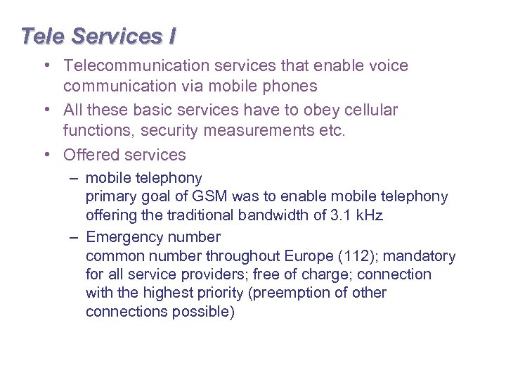 Tele Services I • Telecommunication services that enable voice communication via mobile phones • All these basic services have to obey cellular functions, security measurements etc. • Offered services – mobile telephony primary goal of GSM was to enable mobile telephony offering the traditional bandwidth of 3. 1 k. Hz – Emergency number common number throughout Europe (112); mandatory for all service providers; free of charge; connection with the highest priority (preemption of other connections possible)