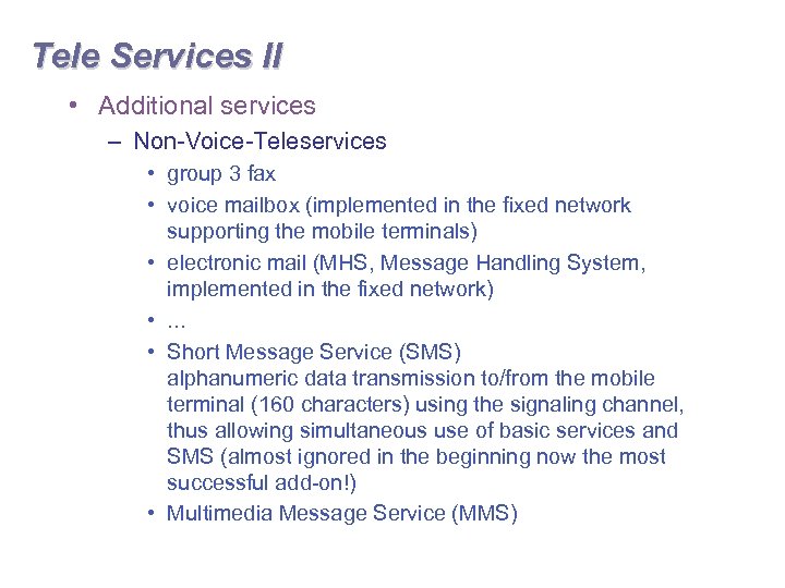 Tele Services II • Additional services – Non-Voice-Teleservices • group 3 fax • voice mailbox (implemented in the fixed network supporting the mobile terminals) • electronic mail (MHS, Message Handling System, implemented in the fixed network) • . . . • Short Message Service (SMS) alphanumeric data transmission to/from the mobile terminal (160 characters) using the signaling channel, thus allowing simultaneous use of basic services and SMS (almost ignored in the beginning now the most successful add-on!) • Multimedia Message Service (MMS)
