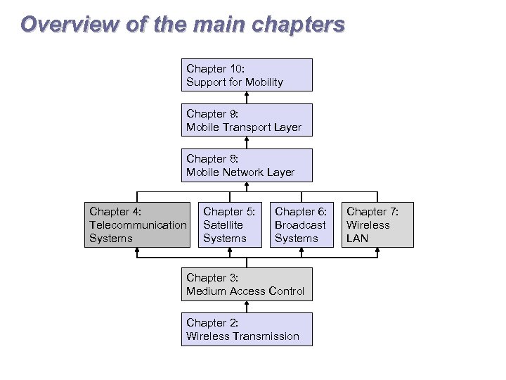 Overview of the main chapters Chapter 10: Support for Mobility Chapter 9: Mobile Transport Layer Chapter 8: Mobile Network Layer Chapter 4: Telecommunication Systems Chapter 5: Satellite Systems Chapter 6: Broadcast Systems Chapter 3: Medium Access Control Chapter 2: Wireless Transmission Chapter 7: Wireless LAN