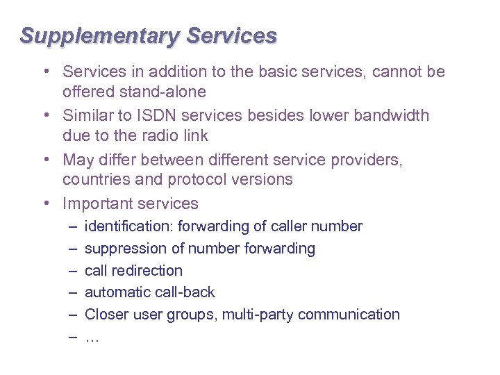 Supplementary Services • Services in addition to the basic services, cannot be offered stand-alone • Similar to ISDN services besides lower bandwidth due to the radio link • May differ between different service providers, countries and protocol versions • Important services – – – identification: forwarding of caller number suppression of number forwarding call redirection automatic call-back Closer user groups, multi-party communication …