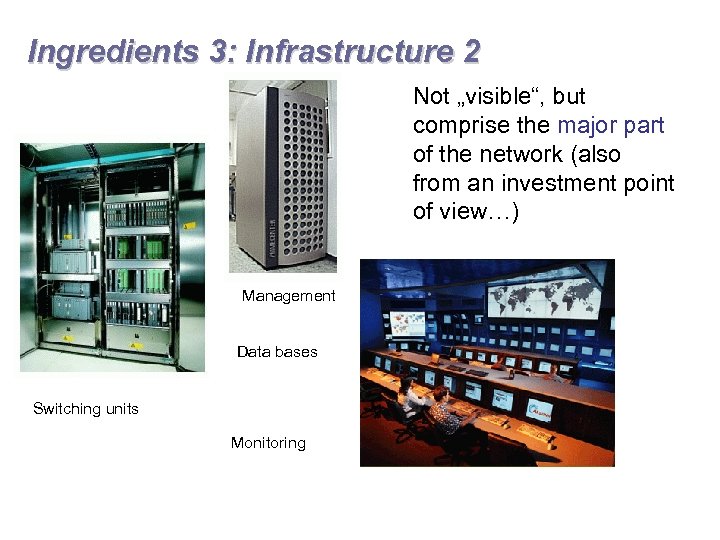 Ingredients 3: Infrastructure 2 Not „visible“, but comprise the major part of the network (also from an investment point of view…) Management Data bases Switching units Monitoring