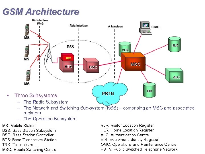 GSM Architecture • Three Subsystems: – The Radio Subsystem – The Network and Switching Sub-system (NSS) – comprising an MSC and associated registers – The Operation Subsystem MS: Mobile Station BSS: Base Station Subsystem BSC: Base Station Controller BTS: Base Transceiver Station TRX: Transceiver MSC: Mobile Switching Centre VLR: Visitor Location Register HLR: Home Location Register Au. C: Authentication Centre EIR: Equipment Identity Register OMC: Operations and Maintenance Centre PSTN: Public Switched Telephone Network