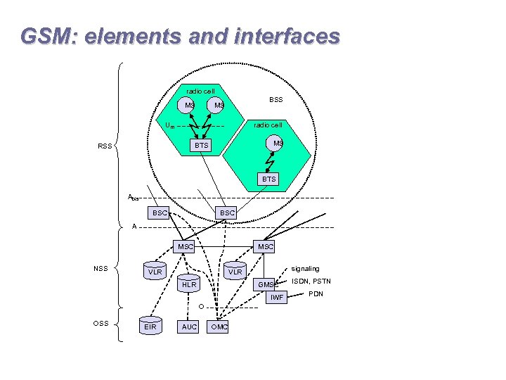 GSM: elements and interfaces radio cell MS BSS MS Um radio cell MS BTS RSS BTS Abis BSC A MSC NSS MSC VLR signaling VLR GMSC HLR IWF O OSS EIR AUC OMC ISDN, PSTN PDN