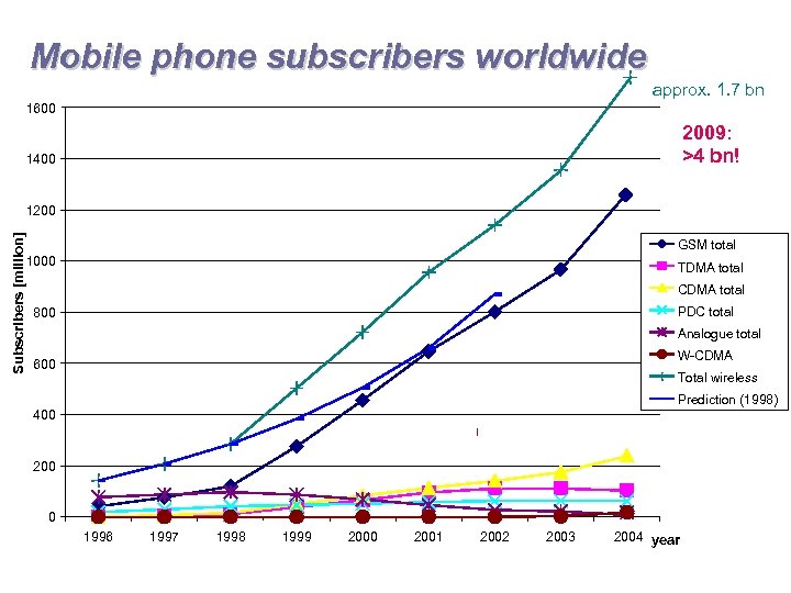 Mobile phone subscribers worldwide approx. 1. 7 bn 1600 2009: >4 bn! 1400 Subscribers [million] 1200 GSM total 1000 TDMA total CDMA total PDC total 800 Analogue total W-CDMA 600 Total wireless Prediction (1998) 400 200 0 1996 1997 1998 1999 2000 2001 2002 2003 2004 year