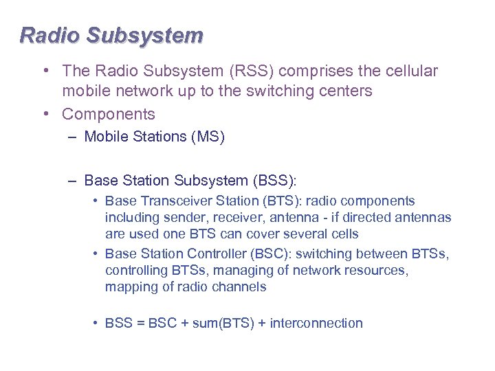 Radio Subsystem • The Radio Subsystem (RSS) comprises the cellular mobile network up to the switching centers • Components – Mobile Stations (MS) – Base Station Subsystem (BSS): • Base Transceiver Station (BTS): radio components including sender, receiver, antenna - if directed antennas are used one BTS can cover several cells • Base Station Controller (BSC): switching between BTSs, controlling BTSs, managing of network resources, mapping of radio channels • BSS = BSC + sum(BTS) + interconnection