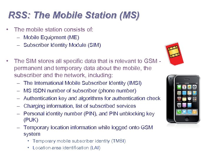 RSS: The Mobile Station (MS) • The mobile station consists of: – Mobile Equipment (ME) – Subscriber Identity Module (SIM) • The SIM stores all specific data that is relevant to GSM permanent and temporary data about the mobile, the subscriber and the network, including: – – – The International Mobile Subscriber Identity (IMSI) MS ISDN number of subscriber (phone number) Authentication key and algorithms for authentication check Charging information, list of subscribed services Personal identity number (PIN), and PIN unblocking key (PUK) – Temporary location information while logged onto GSM system • Temporary mobile subscriber identity (TMSI) • Location area identification (LAI)