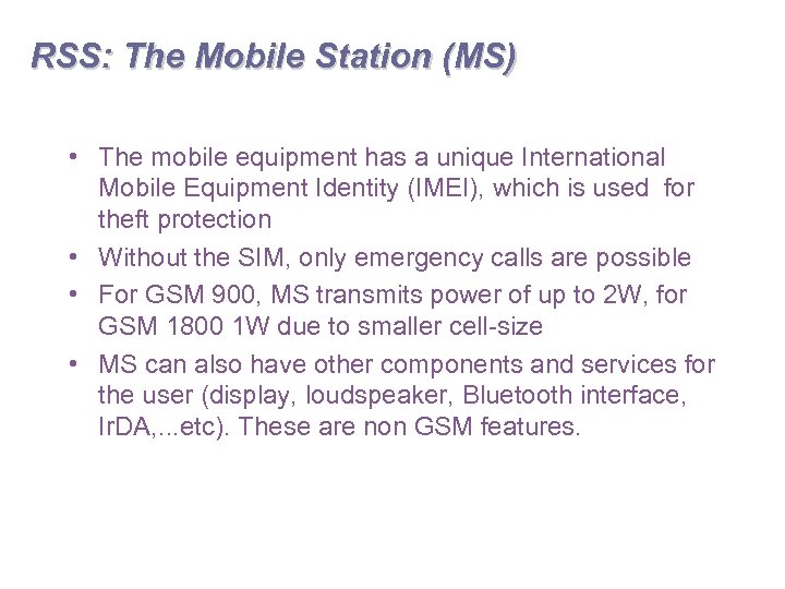 RSS: The Mobile Station (MS) • The mobile equipment has a unique International Mobile Equipment Identity (IMEI), which is used for theft protection • Without the SIM, only emergency calls are possible • For GSM 900, MS transmits power of up to 2 W, for GSM 1800 1 W due to smaller cell-size • MS can also have other components and services for the user (display, loudspeaker, Bluetooth interface, Ir. DA, . . . etc). These are non GSM features.