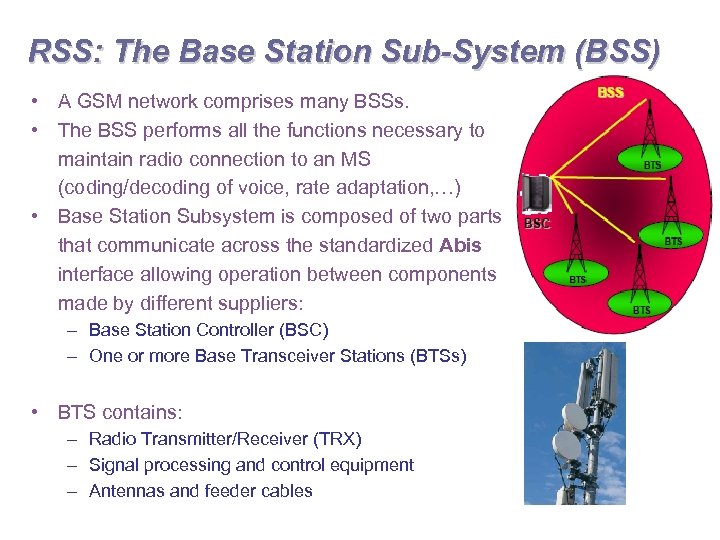 RSS: The Base Station Sub-System (BSS) • A GSM network comprises many BSSs. • The BSS performs all the functions necessary to maintain radio connection to an MS (coding/decoding of voice, rate adaptation, …) • Base Station Subsystem is composed of two parts that communicate across the standardized Abis interface allowing operation between components made by different suppliers: – Base Station Controller (BSC) – One or more Base Transceiver Stations (BTSs) • BTS contains: – Radio Transmitter/Receiver (TRX) – Signal processing and control equipment – Antennas and feeder cables