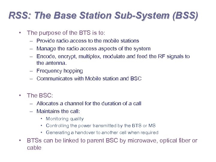 RSS: The Base Station Sub-System (BSS) • The purpose of the BTS is to: – Provide radio access to the mobile stations – Manage the radio access aspects of the system – Encode, encrypt, multiplex, modulate and feed the RF signals to the antenna. – Frequency hopping – Communicates with Mobile station and BSC • The BSC: – Allocates a channel for the duration of a call – Maintains the call: • Monitoring quality • Controlling the power transmitted by the BTS or MS • Generating a handover to another cell when required • BTSs can be linked to parent BSC by microwave, optical fiber or cable