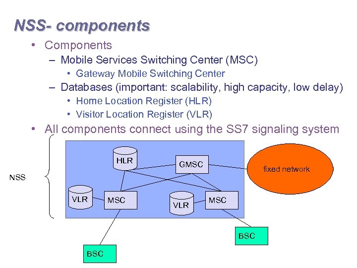 NSS- components • Components – Mobile Services Switching Center (MSC) • Gateway Mobile Switching Center – Databases (important: scalability, high capacity, low delay) • Home Location Register (HLR) • Visitor Location Register (VLR) • All components connect using the SS 7 signaling system HLR GMSC fixed network NSS VLR MSC BSC