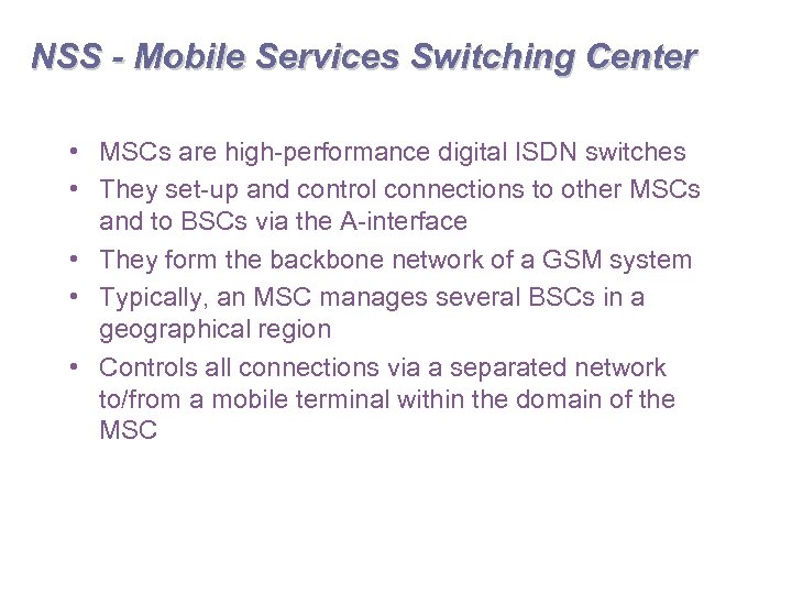 NSS - Mobile Services Switching Center • MSCs are high-performance digital ISDN switches • They set-up and control connections to other MSCs and to BSCs via the A-interface • They form the backbone network of a GSM system • Typically, an MSC manages several BSCs in a geographical region • Controls all connections via a separated network to/from a mobile terminal within the domain of the MSC