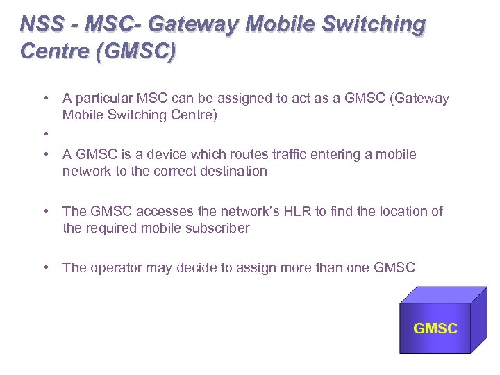 NSS - MSC- Gateway Mobile Switching Centre (GMSC) • A particular MSC can be assigned to act as a GMSC (Gateway Mobile Switching Centre) • • A GMSC is a device which routes traffic entering a mobile network to the correct destination • The GMSC accesses the network’s HLR to find the location of the required mobile subscriber • The operator may decide to assign more than one GMSC