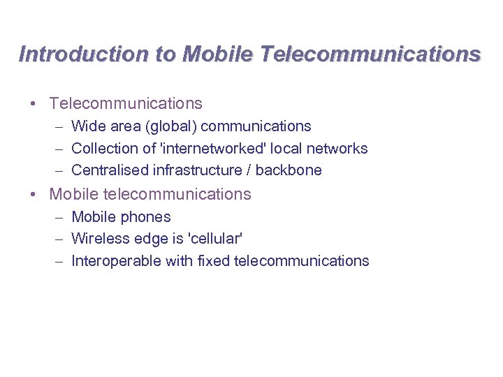 Introduction to Mobile Telecommunications • Telecommunications – Wide area (global) communications – Collection of 'internetworked' local networks – Centralised infrastructure / backbone • Mobile telecommunications – Mobile phones – Wireless edge is 'cellular' – Interoperable with fixed telecommunications