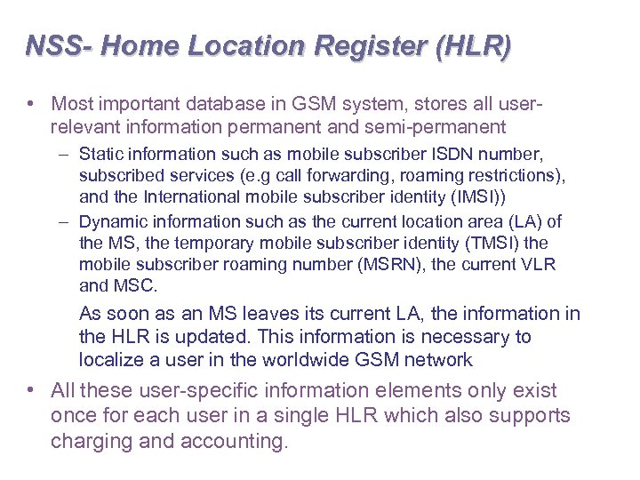NSS- Home Location Register (HLR) • Most important database in GSM system, stores all userrelevant information permanent and semi-permanent – Static information such as mobile subscriber ISDN number, subscribed services (e. g call forwarding, roaming restrictions), and the International mobile subscriber identity (IMSI)) – Dynamic information such as the current location area (LA) of the MS, the temporary mobile subscriber identity (TMSI) the mobile subscriber roaming number (MSRN), the current VLR and MSC. As soon as an MS leaves its current LA, the information in the HLR is updated. This information is necessary to localize a user in the worldwide GSM network • All these user-specific information elements only exist once for each user in a single HLR which also supports charging and accounting.