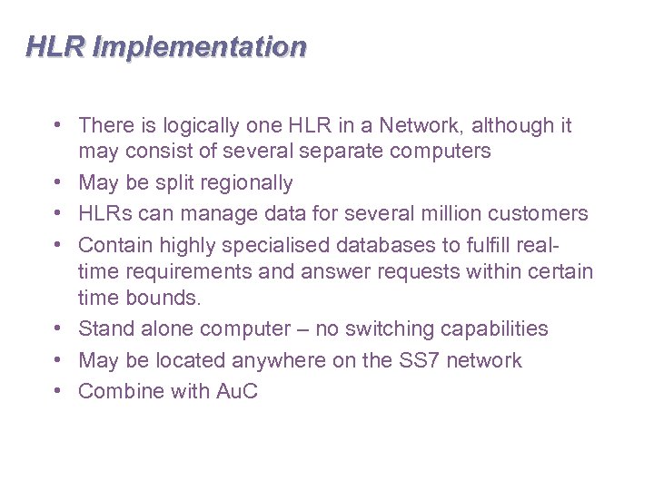 HLR Implementation • There is logically one HLR in a Network, although it may consist of several separate computers • May be split regionally • HLRs can manage data for several million customers • Contain highly specialised databases to fulfill realtime requirements and answer requests within certain time bounds. • Stand alone computer – no switching capabilities • May be located anywhere on the SS 7 network • Combine with Au. C