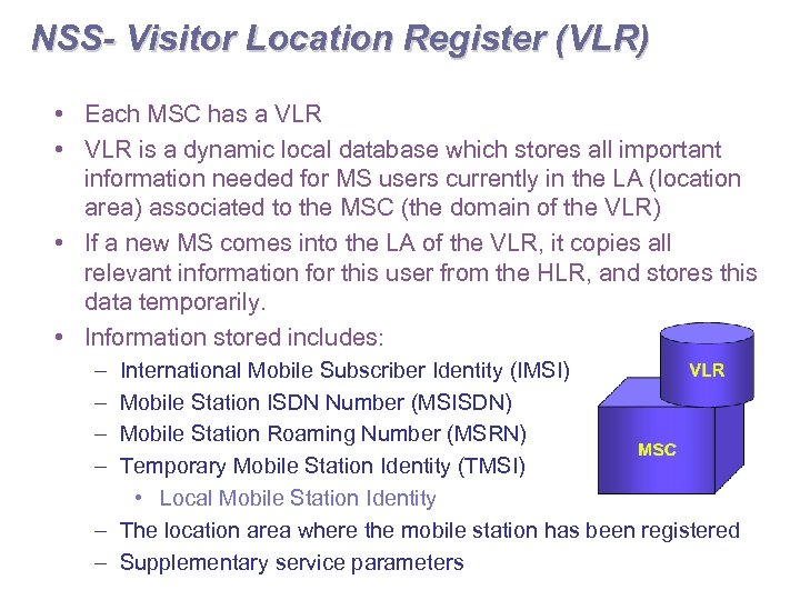 NSS- Visitor Location Register (VLR) • Each MSC has a VLR • VLR is a dynamic local database which stores all important information needed for MS users currently in the LA (location area) associated to the MSC (the domain of the VLR) • If a new MS comes into the LA of the VLR, it copies all relevant information for this user from the HLR, and stores this data temporarily. • Information stored includes: – – International Mobile Subscriber Identity (IMSI) Mobile Station ISDN Number (MSISDN) Mobile Station Roaming Number (MSRN) Temporary Mobile Station Identity (TMSI) • Local Mobile Station Identity – The location area where the mobile station has been registered – Supplementary service parameters