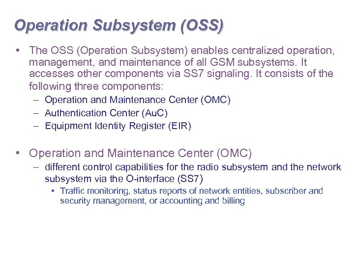Operation Subsystem (OSS) • The OSS (Operation Subsystem) enables centralized operation, management, and maintenance of all GSM subsystems. It accesses other components via SS 7 signaling. It consists of the following three components: – Operation and Maintenance Center (OMC) – Authentication Center (Au. C) – Equipment Identity Register (EIR) • Operation and Maintenance Center (OMC) – different control capabilities for the radio subsystem and the network subsystem via the O-interface (SS 7) • Traffic monitoring, status reports of network entities, subscriber and security management, or accounting and billing