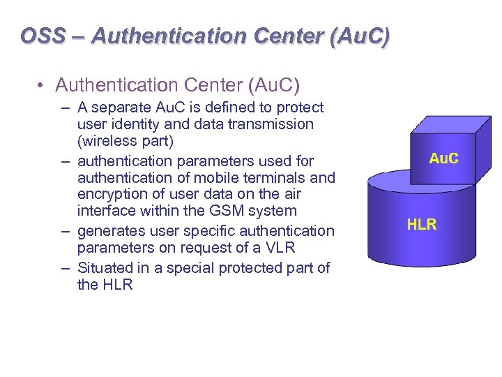 OSS – Authentication Center (Au. C) • Authentication Center (Au. C) – A separate Au. C is defined to protect user identity and data transmission (wireless part) – authentication parameters used for authentication of mobile terminals and encryption of user data on the air interface within the GSM system – generates user specific authentication parameters on request of a VLR – Situated in a special protected part of the HLR