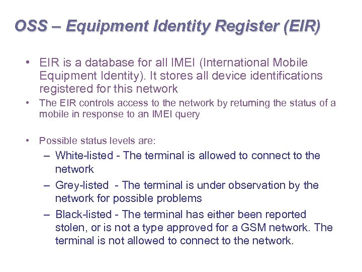 OSS – Equipment Identity Register (EIR) • EIR is a database for all IMEI (International Mobile Equipment Identity). It stores all device identifications registered for this network • The EIR controls access to the network by returning the status of a mobile in response to an IMEI query • Possible status levels are: – White-listed - The terminal is allowed to connect to the network – Grey-listed - The terminal is under observation by the network for possible problems – Black-listed - The terminal has either been reported stolen, or is not a type approved for a GSM network. The terminal is not allowed to connect to the network.