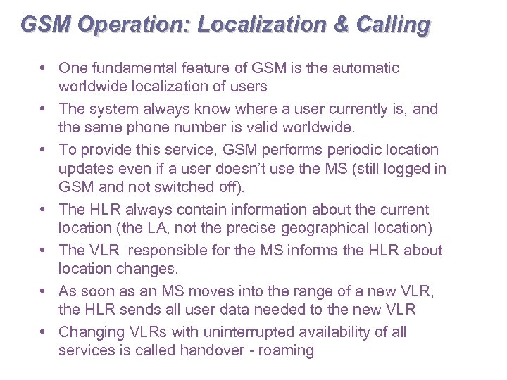 GSM Operation: Localization & Calling • One fundamental feature of GSM is the automatic worldwide localization of users • The system always know where a user currently is, and the same phone number is valid worldwide. • To provide this service, GSM performs periodic location updates even if a user doesn’t use the MS (still logged in GSM and not switched off). • The HLR always contain information about the current location (the LA, not the precise geographical location) • The VLR responsible for the MS informs the HLR about location changes. • As soon as an MS moves into the range of a new VLR, the HLR sends all user data needed to the new VLR • Changing VLRs with uninterrupted availability of all services is called handover - roaming