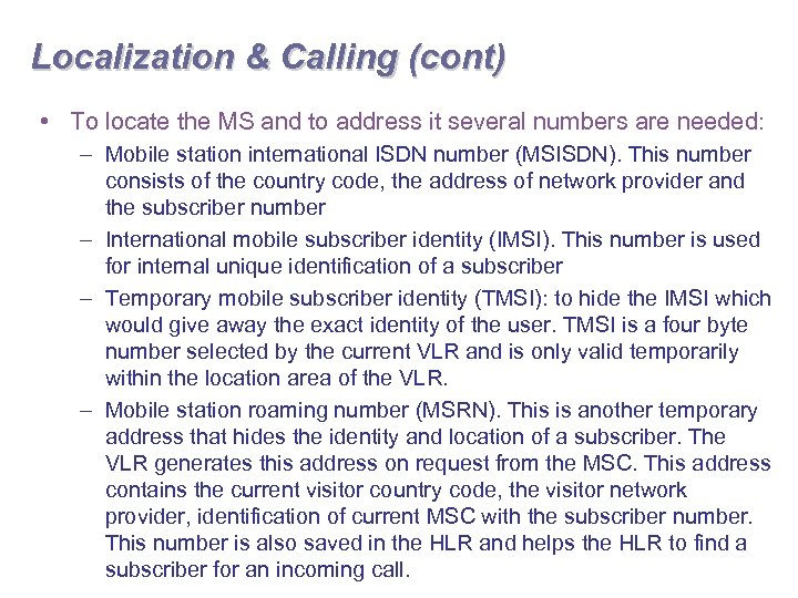 Localization & Calling (cont) • To locate the MS and to address it several numbers are needed: – Mobile station international ISDN number (MSISDN). This number consists of the country code, the address of network provider and the subscriber number – International mobile subscriber identity (IMSI). This number is used for internal unique identification of a subscriber – Temporary mobile subscriber identity (TMSI): to hide the IMSI which would give away the exact identity of the user. TMSI is a four byte number selected by the current VLR and is only valid temporarily within the location area of the VLR. – Mobile station roaming number (MSRN). This is another temporary address that hides the identity and location of a subscriber. The VLR generates this address on request from the MSC. This address contains the current visitor country code, the visitor network provider, identification of current MSC with the subscriber number. This number is also saved in the HLR and helps the HLR to find a subscriber for an incoming call.