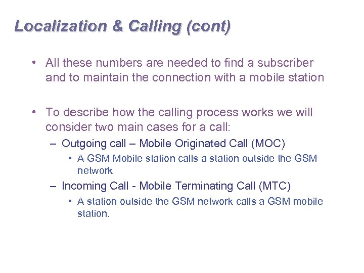 Localization & Calling (cont) • All these numbers are needed to find a subscriber and to maintain the connection with a mobile station • To describe how the calling process works we will consider two main cases for a call: – Outgoing call – Mobile Originated Call (MOC) • A GSM Mobile station calls a station outside the GSM network – Incoming Call - Mobile Terminating Call (MTC) • A station outside the GSM network calls a GSM mobile station.