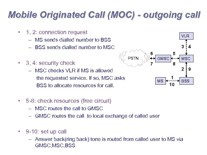 Mobile Originated Call (MOC) - outgoing call • 1, 2: connection request VLR – MS sends dialled number to BSS – BSS sends dialled number to MSC 3 4 6 • 3, 4: security check – MSC checks VLR if MS is allowed the requested service. If so, MSC asks BSS to allocate resources for call. PSTN 5 GMSC 7 MSC 8 2 9 MS 1 10 BSS • 5 -8: check resources (free circuit) – MSC routes the call to GMSC – GMSC routes the call to local exchange of called user • 9 -10: set up call – Answer back(ring back) tone is routed from called user to MS via GMSC, BSS