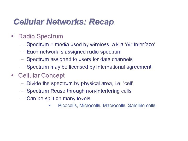 Cellular Networks: Recap • Radio Spectrum – – Spectrum = media used by wireless, a. k. a ‘Air Interface’ Each network is assigned radio spectrum Spectrum assigned to users for data channels Spectrum may be licensed by international agreement • Cellular Concept – Divide the spectrum by physical area, i. e. ‘cell’ – Spectrum Reuse through non-interfering cells – Can be split on many levels • Picocells, Microcells, Macrocells, Satellite cells