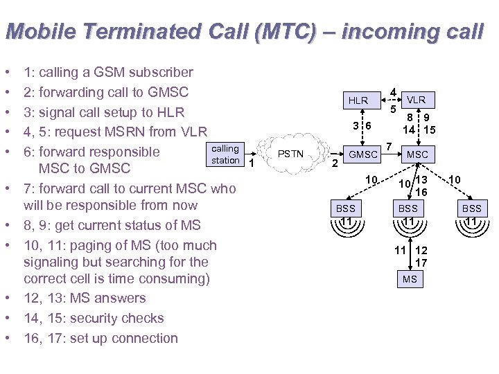 Mobile Terminated Call (MTC) – incoming call • • • 1: calling a GSM subscriber 2: forwarding call to GMSC 3: signal call setup to HLR 4, 5: request MSRN from VLR calling 6: forward responsible station MSC to GMSC 7: forward call to current MSC who will be responsible from now 8, 9: get current status of MS 10, 11: paging of MS (too much signaling but searching for the correct cell is time consuming) 12, 13: MS answers 14, 15: security checks 16, 17: set up connection HLR 4 5 3 6 1 PSTN 2 GMSC 10 7 VLR 8 9 14 15 MSC 10 13 16 10 BSS BSS 11 11 12 17 MS