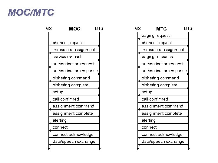 MOC/MTC MS MOC BTS MS MTC BTS paging request channel request immediate assignment service request paging response authentication request authentication response ciphering command ciphering complete setup call confirmed assignment command assignment complete alerting connect acknowledge data/speech exchange