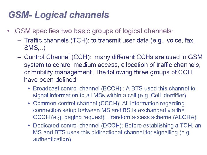 GSM- Logical channels • GSM specifies two basic groups of logical channels: – Traffic channels (TCH): to transmit user data (e. g. , voice, fax, SMS, . . ) – Control Channel (CCH): many different CCHs are used in GSM system to control medium access, allocation of traffic channels, or mobility management. The following three groups of CCH have been defined: • Broadcast control channel (BCCH) : A BTS used this channel to signal information to all MSs within a cell (e. g. Cell identifier) • Common control channel (CCCH): All information regarding connection setup between MS and BS is exchanged via the CCCH (e. g. paging request) – random access scheme (ALOHA) • Dedicated control channel (DCCH): Before establishing a TCH, an MS and BTS uses this bidirectional channel for signalling (e. g. authentication)