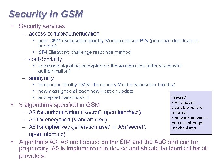 Security in GSM • Security services – access control/authentication • user SIM (Subscriber Identity Module): secret PIN (personal identification number) • SIM network: challenge response method – confidentiality • voice and signaling encrypted on the wireless link (after successful authentication) – anonymity • temporary identity TMSI (Temporary Mobile Subscriber Identity) • newly assigned at each new location update “secret”: • encrypted transmission • 3 algorithms specified in GSM – A 3 for authentication (“secret”, open interface) – A 5 for encryption (standardized) – A 8 for cipher key generation used in A 5(“secret”, open interface) • A 3 and A 8 available via the Internet • network providers can use stronger mechanisms • Algorithms A 3, A 8 are located on the SIM and the Au. C and can be proprietary. A 5 is implemented in device and should be identical for all providers.