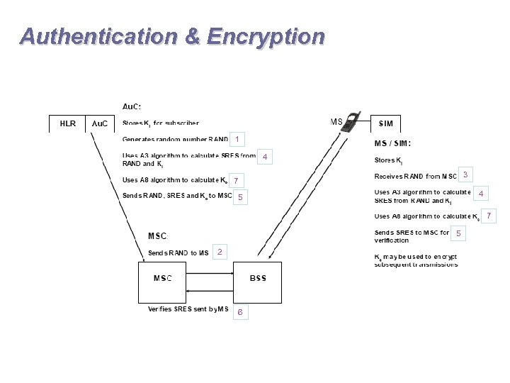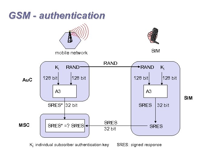 GSM - authentication SIM mobile network Ki Au. C 128 bit RAND Ki 128 bit A 3 SIM SRES* 32 bit MSC SRES* =? SRES 32 bit Ki: individual subscriber authentication key 32 bit SRES: signed response