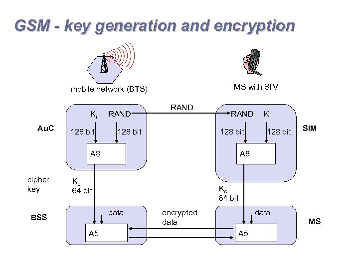 GSM - key generation and encryption MS with SIM mobile network (BTS) Ki Au. C 128 bit RAND 128 bit A 8 cipher key SIM Kc 64 bit data A 5 128 bit A 8 Kc 64 bit BSS Ki encrypted data SRES data MS A 5