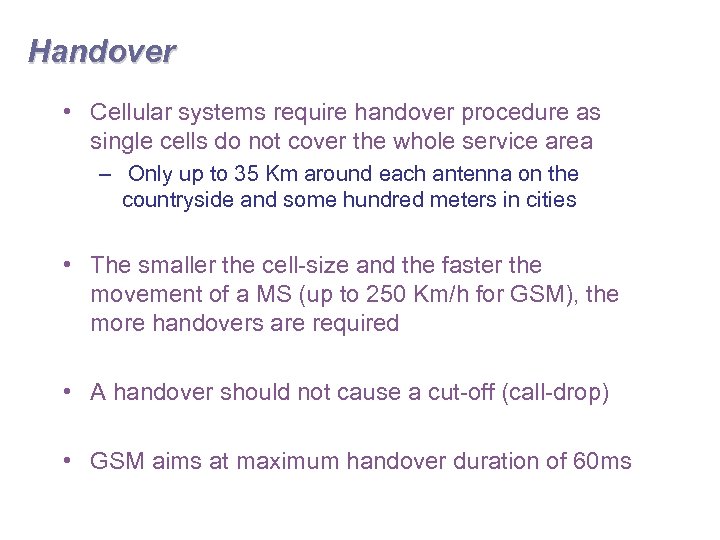 Handover • Cellular systems require handover procedure as single cells do not cover the whole service area – Only up to 35 Km around each antenna on the countryside and some hundred meters in cities • The smaller the cell-size and the faster the movement of a MS (up to 250 Km/h for GSM), the more handovers are required • A handover should not cause a cut-off (call-drop) • GSM aims at maximum handover duration of 60 ms