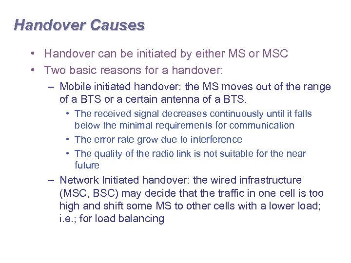 Handover Causes • Handover can be initiated by either MS or MSC • Two basic reasons for a handover: – Mobile initiated handover: the MS moves out of the range of a BTS or a certain antenna of a BTS. • The received signal decreases continuously until it falls below the minimal requirements for communication • The error rate grow due to interference • The quality of the radio link is not suitable for the near future – Network Initiated handover: the wired infrastructure (MSC, BSC) may decide that the traffic in one cell is too high and shift some MS to other cells with a lower load; i. e. ; for load balancing
